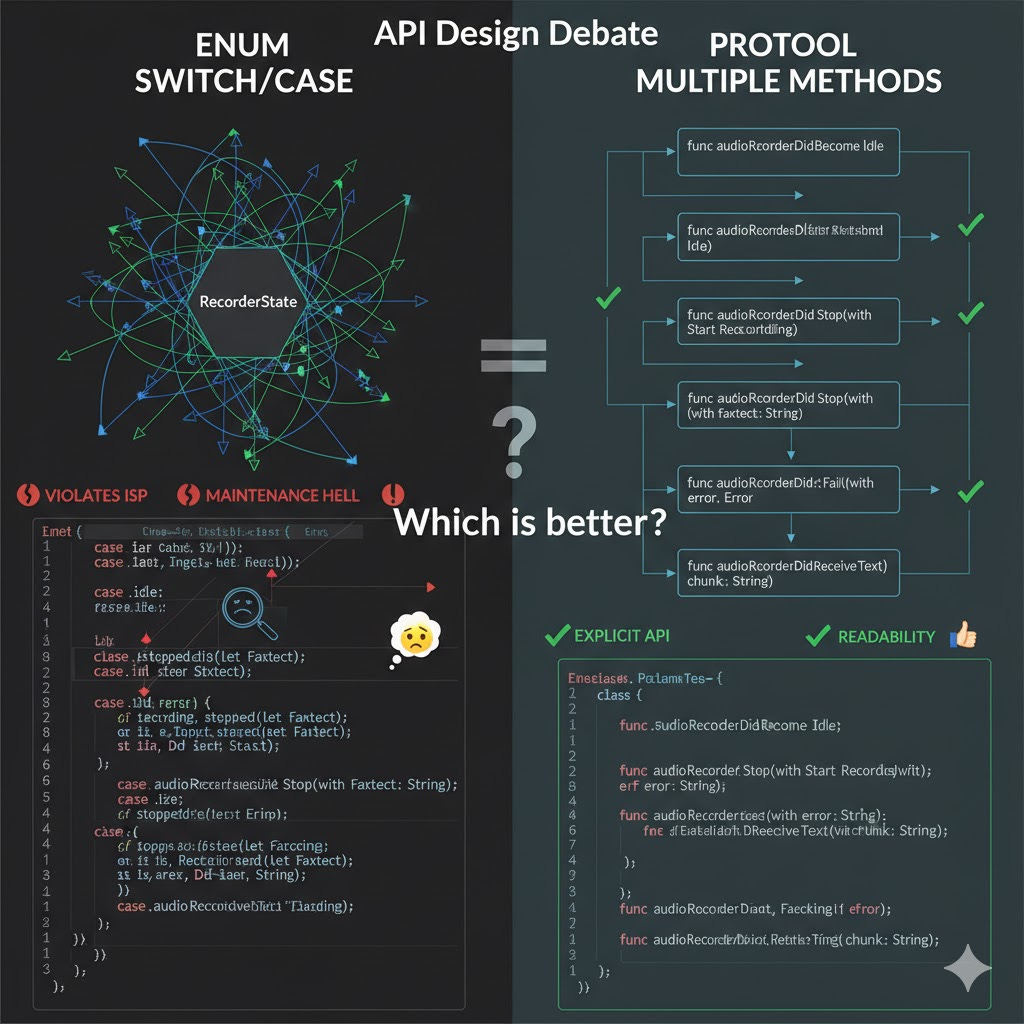 API Design Debate: Enum Switch/Case vs. Protocol with Multiple Method Calls
