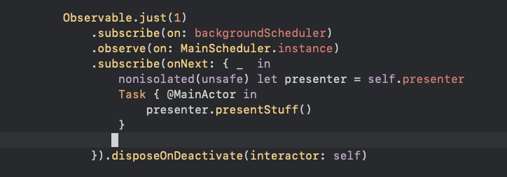 Technically to make it work you could manually set up presenter inline as nonisolated(unsafe) local variable and then call it methods on it in Task { @MainActor in }. Since this would quickly become tedious, I added a helper method presentOnMainThread on PresentableInteractor that will do this for you. It can be called safely from an RxSwift observable callback or from a Task.
