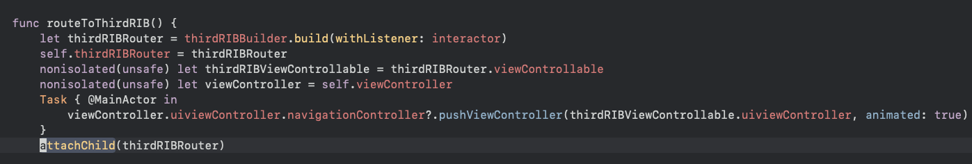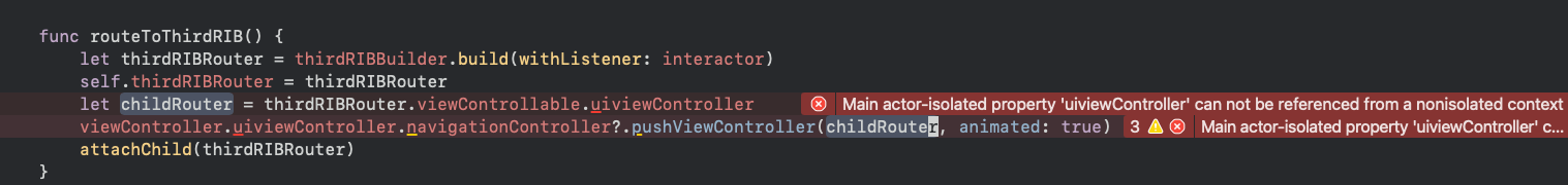 The same type of warning occurs when we try to call methods on UIViewController instances while navigating the UI during viewable RIBs routing. Since router is nonisolated, and routing can actually be triggered from different threads, especially for headless routers, the only thing that really needs to be executed on the main thread is only the UI manipulation part which is the navigation between view controllers.