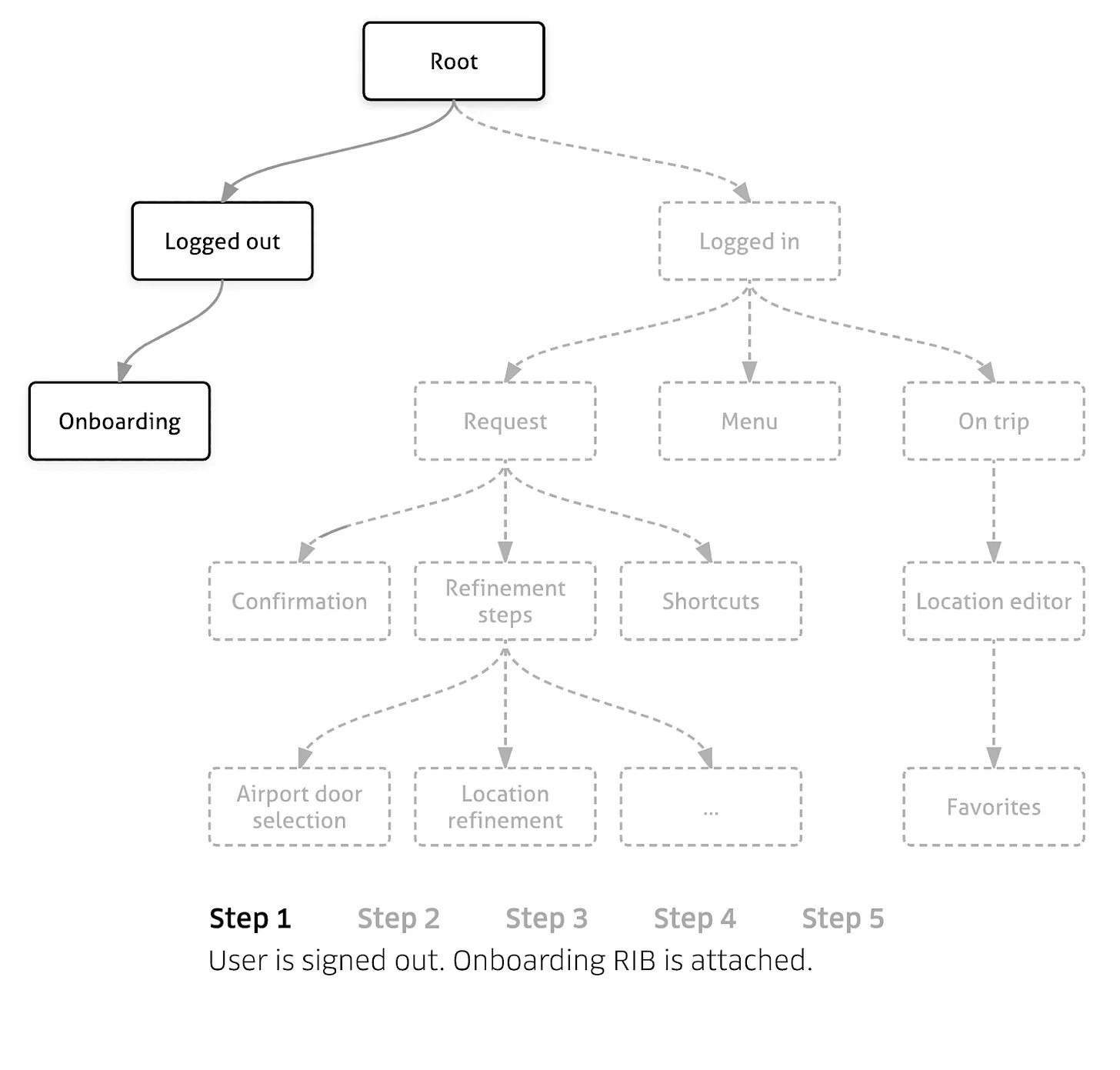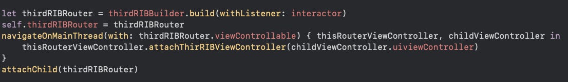 Practically, when you work with RIBs, this doesn’t mean that you have to use RxSwift, but doing so will give you convenient helpers and integrations with RIB’s lifecycle to help you manage your observable streams and async work. You could, of course, roll out your own using Combine, Swift Concurrency’s async/await, or something else. You’d just have to manage your streams of data and async jobs yourself, making them work with the RIB’s lifecycle and ensuring they cancel when a RIB is detached.