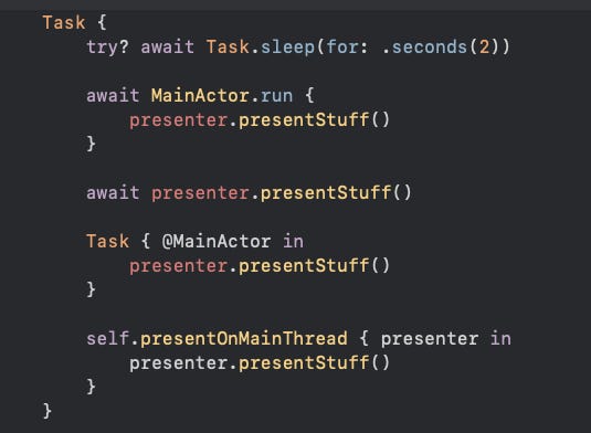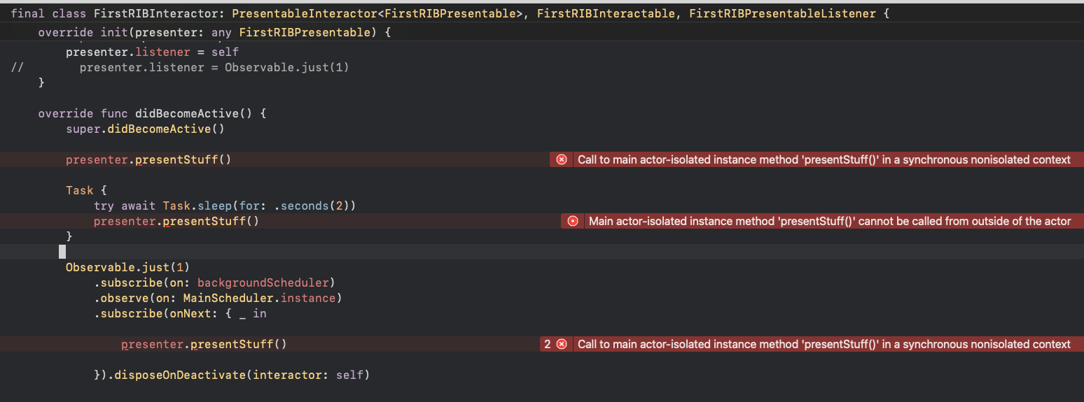 Well, this now means that calls to presenter methods, either directly or in callback blocks from Rx or async/await tasks, will result in the following error: Call to main actor-isolated instance method ‘presentStuff()’ in a synchronous nonisolated context.