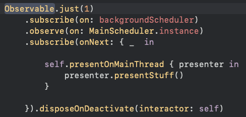 Fundamentally, everything in RIBs can be async and run on different threads, and you as a developer need to manage concurrent access to the data in RIBs on your own. Historically it’s been done via streams RxSwift Observables, Subjects, etc. and in combination with the helper methods such as func disposeOnDeactivate(interactor: Interactor) -> Disposable it works pretty well out of the box. The only thing you’d really need to worry about was running your stream/observable observation callbacks on the main thread when you’d need to render the UI, aka call methods on your RIB’s presenter. This would normally be achieved by adding .observe(on: MainScheduler.instance) call onto observables so that their subscribe next callback block executes on the main thread. It works fine but requires developer discipline to remember to add.